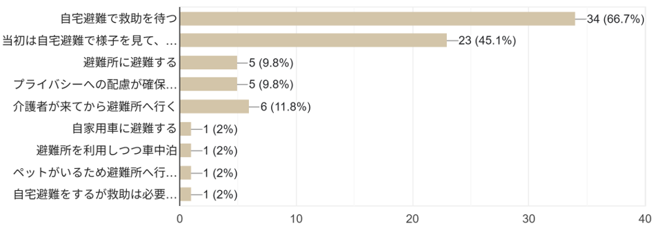 - 全介助のため、避難所での待機・生活は困難と思っている。建物倒壊しない限り自宅にとどまるのが一番トラブルを回避できそう。重度身体障害者施設か病院なら安心して行けるが、災害時に受け入れてもらえないと思う。(40代・四肢機能全廃/ミオパチー)